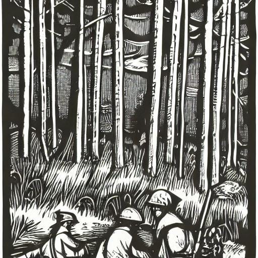 “What’re ye doin’?” Godfrey asked in a hoarse whisper, looking about with obvious dread. He was looking at the surrounding woods, thinking it was a good place for an ambush—and it was, with high aspen trees caught in a gentle breeze, and birch, on both sides of the trail they were following. The night was coming fast; twilight would soon be on them which was even more reason to be off the trail as far as Godfrey was concerned. Godfrey drew his longbow out and strung it as he sat crosslegged in the saddle. He took an arrow out of the quiver hanging from his saddle. He lifted his leg over and jumped down from the saddle. Geoffrey was quick to step down as well.